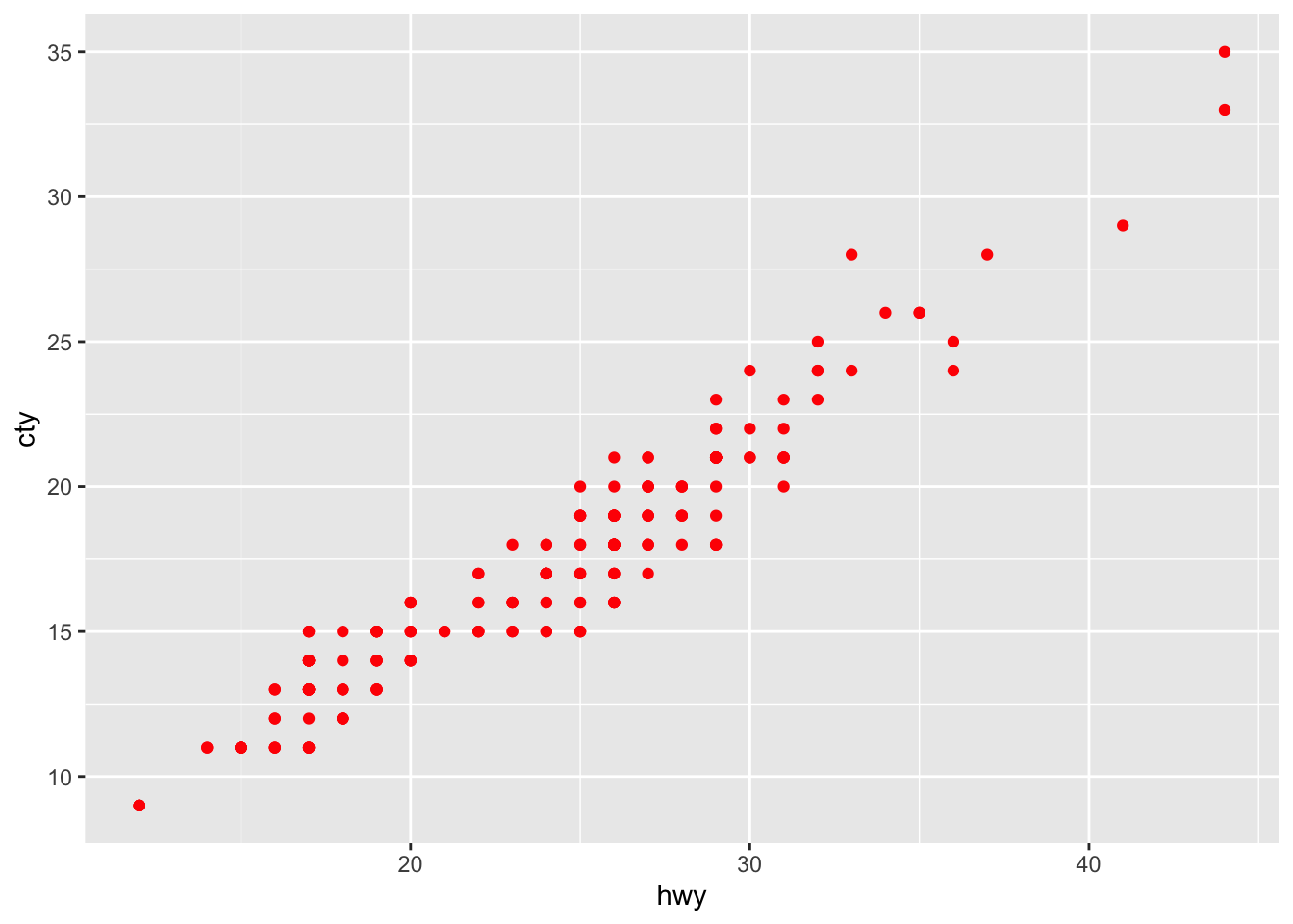library(ggplot2);ggplot(mpg,aes(x=hwy,y=cty))+geom_point(color="red")